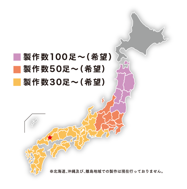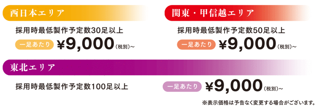 「無料モニター制度」をご利用いただく上での基本条件としましては、本採用決定時の最低製作足数が、中部・北陸・関西・中国・四国・九州地区で 30足以上とさせていただいております。